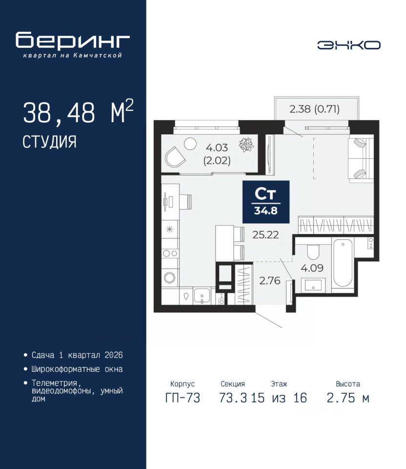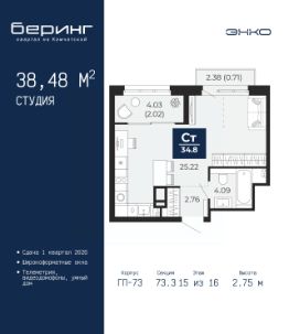 Продается однокомнатная квартира-студия с предчистовой отделкой в ЖК "Беринг" на 15 этаже. Общая площадь: 38.48 кв.м., площадь гостиной 25.22 кв.м., из которых 10 кв.м. выделено под кухонную зону. Все окна выходят на одну сторону. В квартире один балкон и одна лоджия, один совмещенный санузел. Высота потолков 2.75 м.