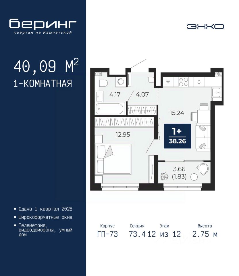 Продается 1-комн. квартира с предчистовой отделкой в ЖК "Беринг" на 12 этаже. Общая площадь: 40.09 кв.м. Высота потолков 2.75 м.