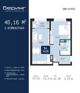 Однокомнатная квартира с предчистовой отделкой в ЖК "Беринг" на 13 этаже. Общая площадь: 46.16 кв.м. Высота потолков 2.75 м.