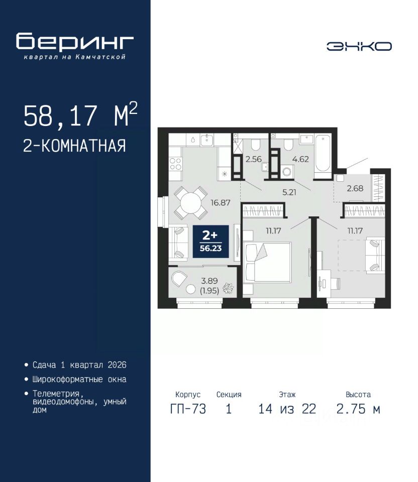 Двухкомнатная квартира от застройщика в ЖК "Беринг" на 14 этаже. Общая площадь: 58.17 кв.м. Высота потолков 2.75 м.