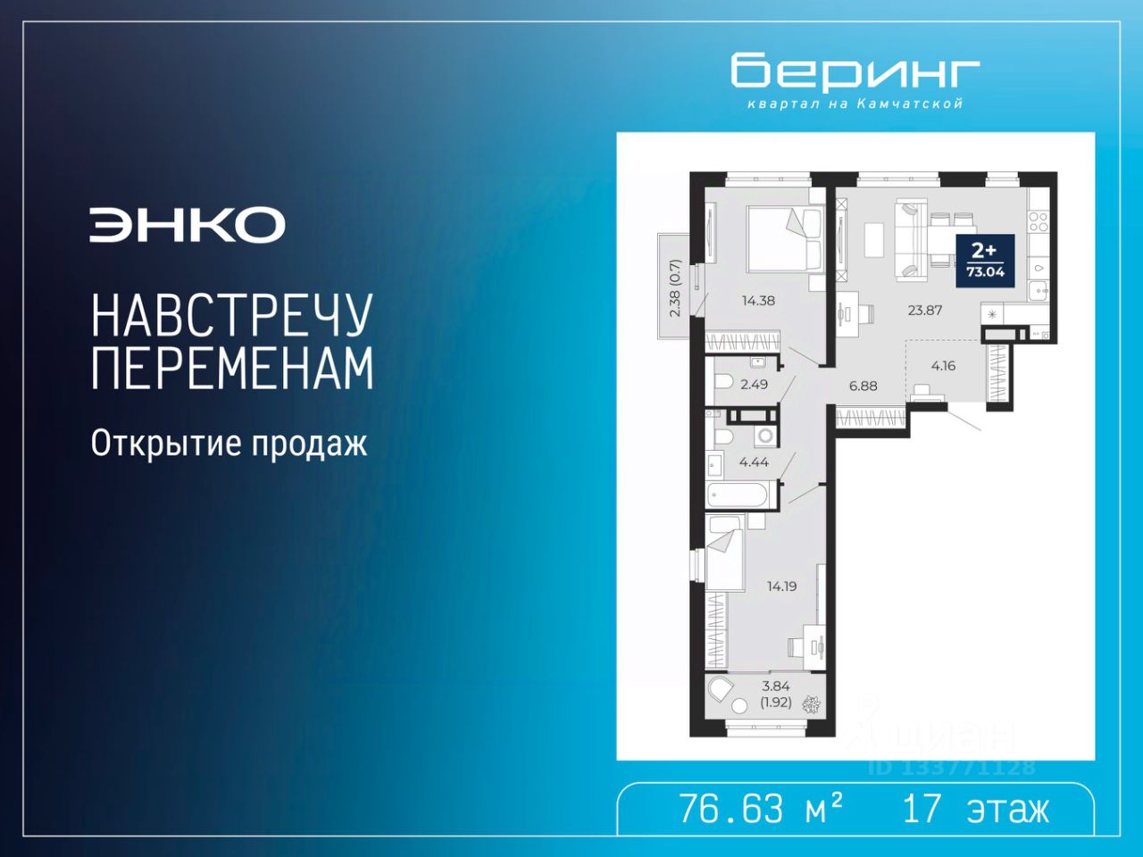 Продается двухкомнатная квартира от застройщика с предчистовой отделкой в ЖК "Беринг" на 17 этаже. Общая площадь: 76.63 кв.м., жилая: 28.57 кв.м., площадь просторной кухни-столовой: 23.87 кв.м. Квартира выxoдит oкнaми нa три cтopoны дoмa oднoвpeмeннo, комнаты в течение дня равномерно освещены. В квартире один балкон, один совмещенный и один раздельный санузел. Высота потолков 2.75 м.