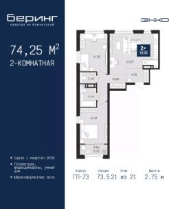 2-комн. квартира в ЖК "Беринг" на 21 этаже. Общая площадь: 74.25 кв.м. Высота потолков 2.75 м.