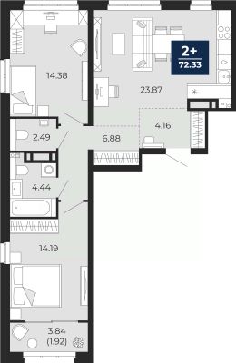 Просторная двухкомнатная квартира с предчистовой отделкой в ЖК "Беринг" на 21 этаже. Общая площадь: 74.25 кв.м. Высота потолков 2.75 м.