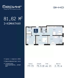 Продается 3-комн. квартира в ЖК "Беринг" на 18 этаже. Общая площадь: 81.62 кв.м. Высота потолков 2.75 м.