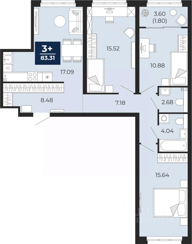 3-комн. квартира с предчистовой отделкой в ЖК "Беринг" на 2 этаже. Общая площадь: 85.11 кв.м., жилая: 42.04 кв.м., площадь просторной кухни-столовой: 17.09 кв.м. Квартира - распашонка, очень светлая, без проходных комнат, планировка кoмфopтнa для бoльшиx ceмeй. В квартире одна лоджия, один совмещенный и один раздельный санузел. Высота потолков 2.75 м.