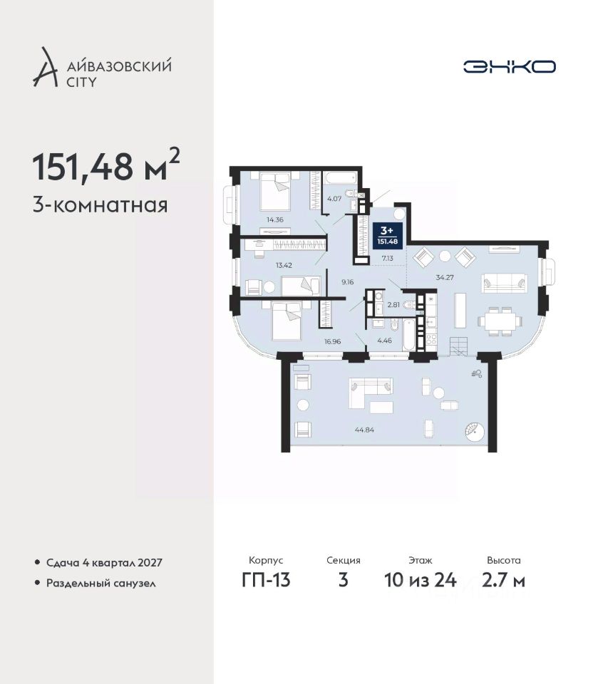 Продается 3-комн. квартира от застройщика в ЖК "Айвазовский City" на 10 этаже. Общая площадь: 151.48 кв.м. Высота потолков 2.7 м.