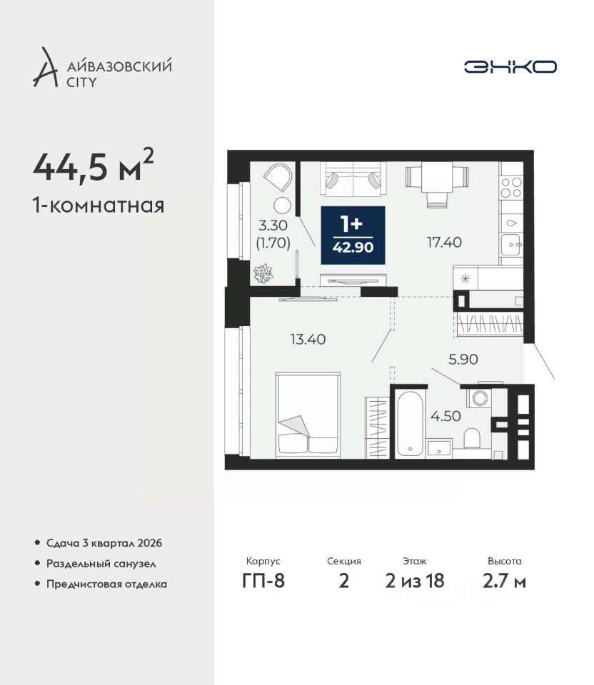 Однокомнатная квартира с предчистовой отделкой в ЖК "Айвазовский City" на 2 этаже. Общая площадь: 44.5 кв.м. Высота потолков 2.7 м.