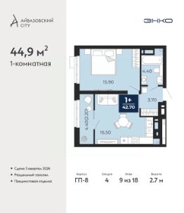 Просторная 1-комн. квартира с предчистовой отделкой в ЖК "Айвазовский City" на 9 этаже. Общая площадь: 44.9 кв.м. Высота потолков 2.7 м.