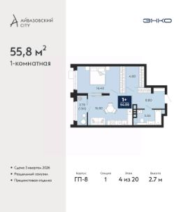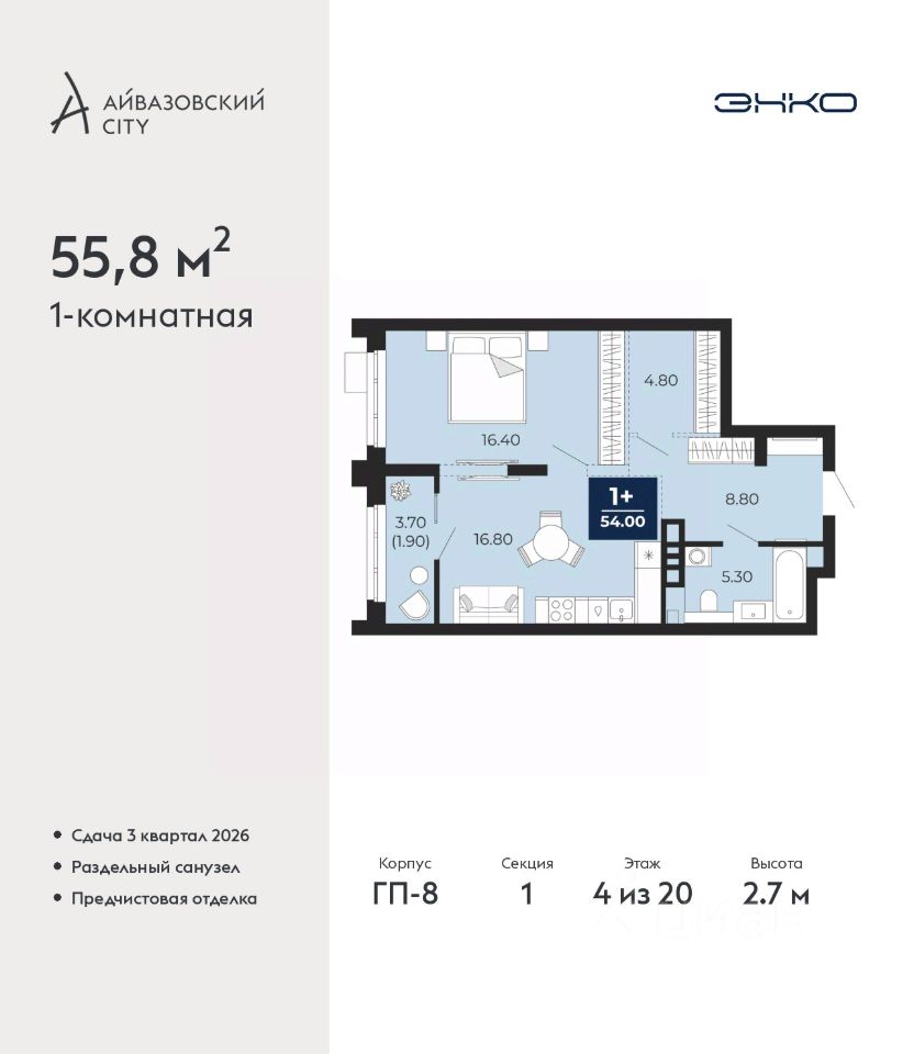 Продается 1-комн. квартира с предчистовой отделкой в ЖК "Айвазовский City" на 4 этаже. Общая площадь: 55.8 кв.м. Высота потолков 2.7 м.