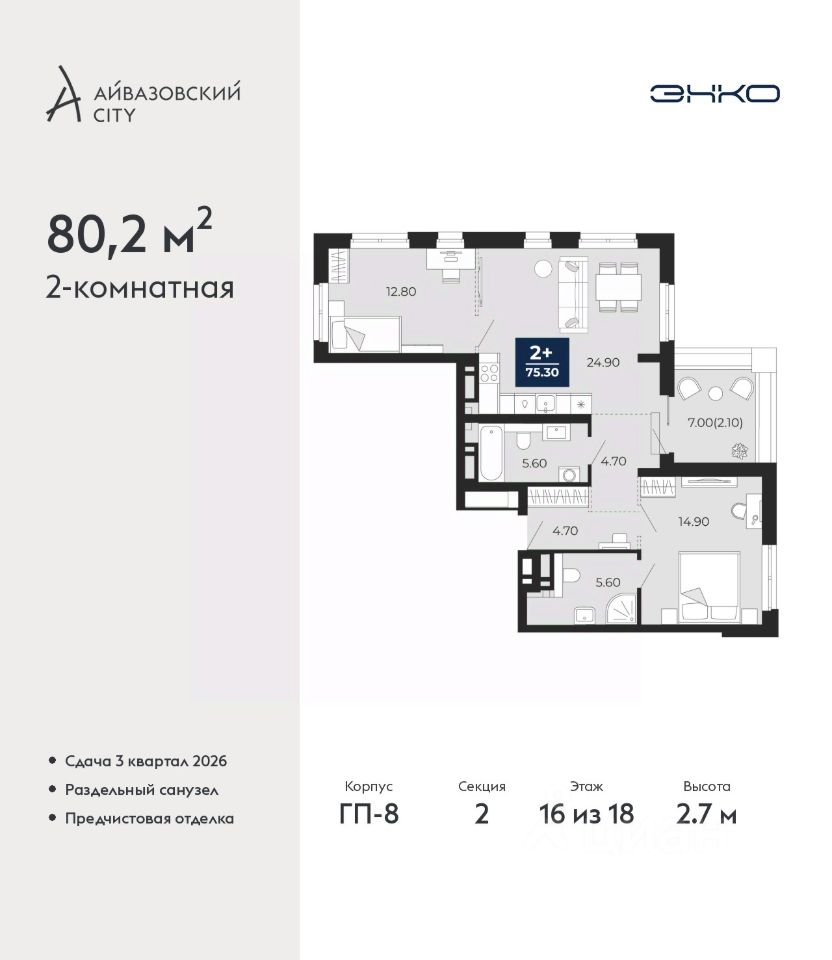 Просторная двухкомнатная квартира с предчистовой отделкой в ЖК "Айвазовский City" на 16 этаже. Общая площадь: 80.2 кв.м. Высота потолков 2.7 м.