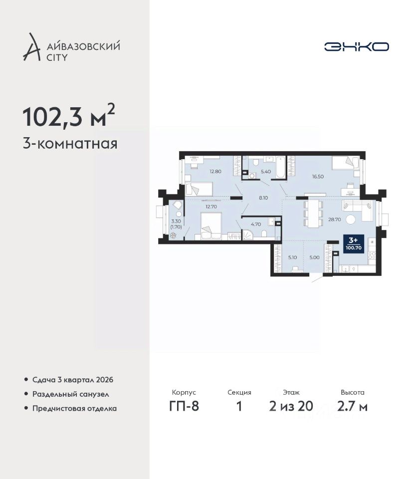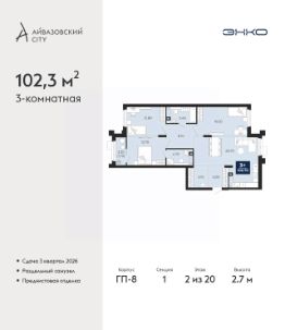 Продается трехкомнатная квартира с предчистовой отделкой в ЖК "Айвазовский City" на 2 этаже. Общая площадь: 102.3 кв.м. Высота потолков 2.7 м.