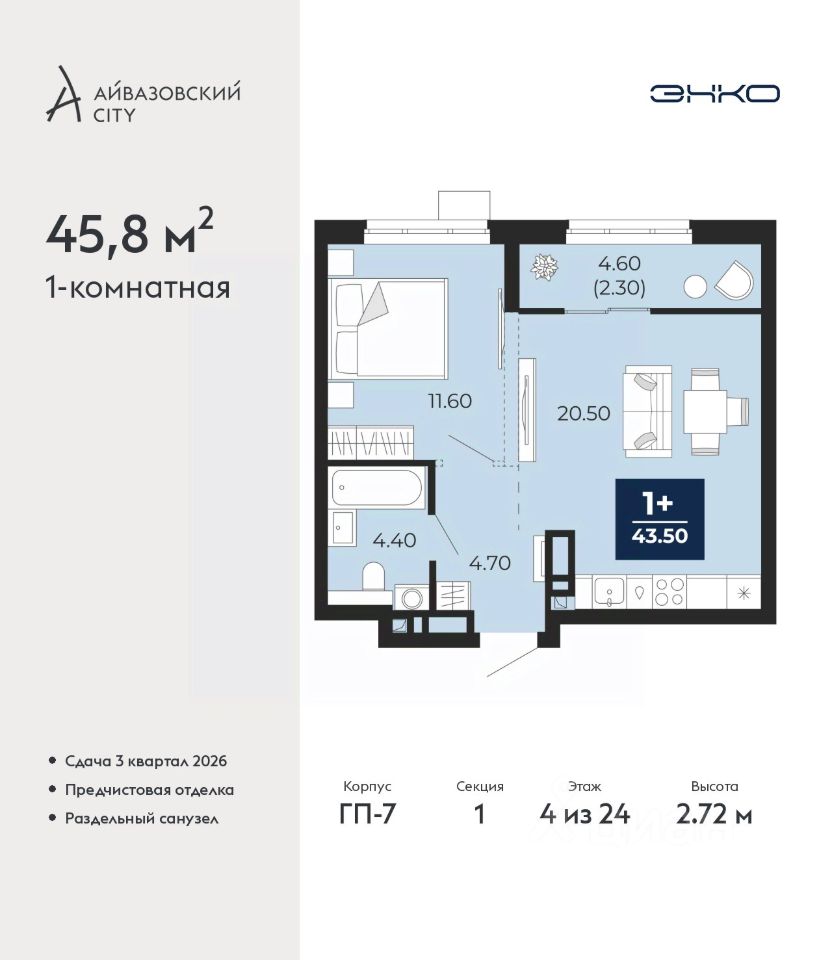 Продается однокомнатная квартира от застройщика с предчистовой отделкой в ЖК "Айвазовский City" на 4 этаже. Общая площадь: 45.8 кв.м. Высота потолков 2.72 м.