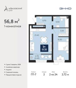 Продается однокомнатная квартира с предчистовой отделкой в ЖК "Айвазовский" на 2 этаже. Общая площадь: 56.8 кв.м., жилая: 15.3 кв.м., площадь просторной кухни-столовой: 21.4 кв.м. Все окна выходят на одну сторону. В квартире одна лоджия, один совмещенный санузел. Высота потолков 2.72 м.