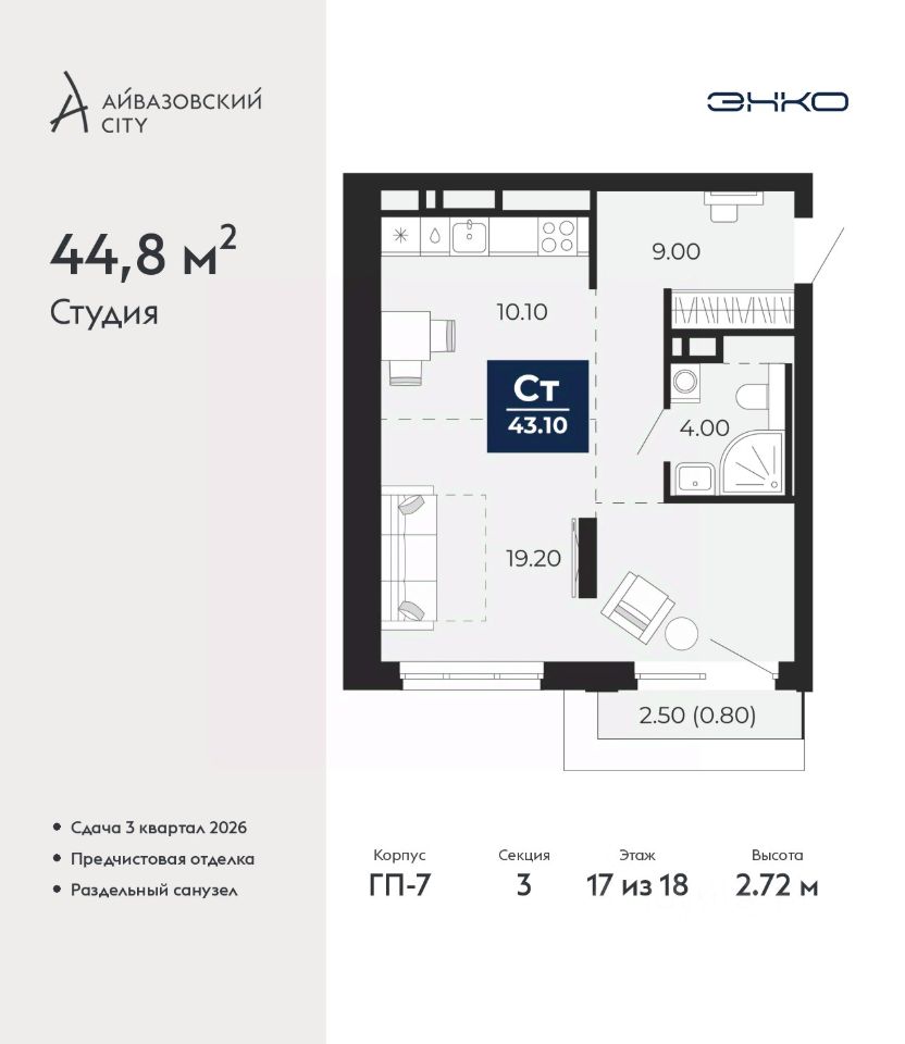 1-комн. квартира-студия от застройщика с предчистовой отделкой в ЖК "Айвазовский City" на 17 этаже. Общая площадь: 44.8 кв.м. Высота потолков 2.72 м.