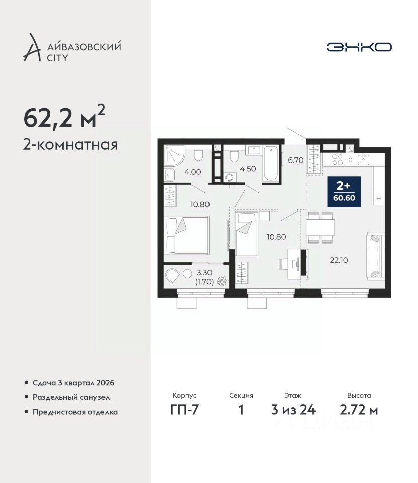 2-комн. квартира с предчистовой отделкой в ЖК "Айвазовский City" на 3 этаже. Общая площадь: 62.2 кв.м. Высота потолков 2.72 м.