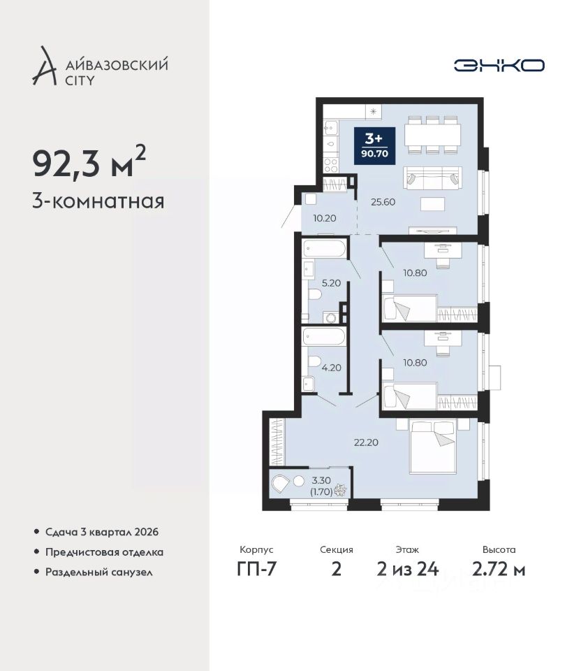 Трехкомнатная квартира от застройщика с предчистовой отделкой в ЖК "Айвазовский City" на 2 этаже. Общая площадь: 92.3 кв.м. Высота потолков 2.72 м.
