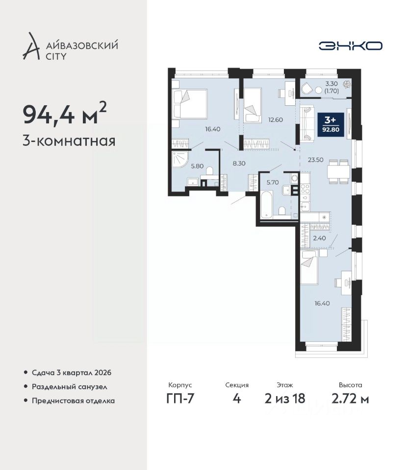 Просторная 3-комн. квартира с предчистовой отделкой в ЖК "Айвазовский City" на 2 этаже. Общая площадь: 94.4 кв.м. Высота потолков 2.72 м.