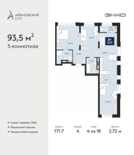 Продается 3-комн. квартира с предчистовой отделкой в ЖК "Айвазовский City" на 4 этаже. Общая площадь: 93.5 кв.м. Высота потолков 2.72 м.