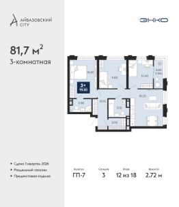 Продается трехкомнатная квартира с предчистовой отделкой в ЖК "Айвазовский City" на 12 этаже. Общая площадь: 81.7 кв.м. Высота потолков 2.72 м.