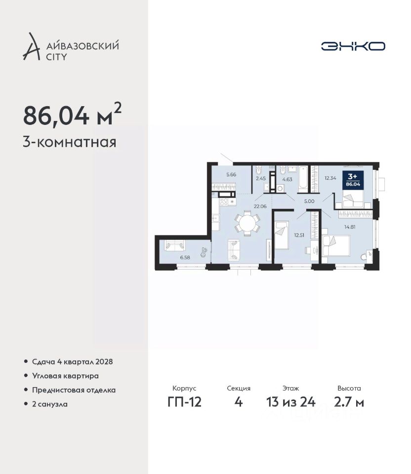 Продается 3-комн. квартира с предчистовой отделкой в ЖК "Айвазовский City" на 13 этаже. Общая площадь: 86.04 кв.м., жилая: 39.66 кв.м., площадь просторной кухни-столовой: 22.06 кв.м. Квартира угловая, идеально подойдет любителям тишины и панорамных видов. В квартире один совмещенный и один раздельный санузел. Высота потолков 2.7 м.