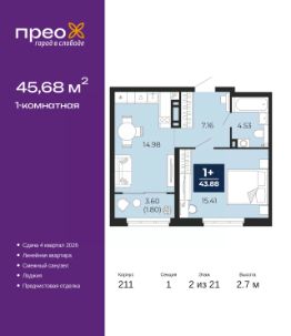 Успейте забронировать, пока действует скидка, период предложения ограничен! Стоимость квартиры указана со скидкой, ваша экономия составит 348,958 руб. По всем вопросам звоните в офис продаж, наши менеджеры вам все расскажут. Продается однокомнатная квартира с предчистовой отделкой в ЖК "Прео" на 2 этаже. Общая площадь: 45.68 кв.м., жилая: 15.41 кв.м., площадь просторной кухни-столовой: 14.98 кв.м. Все окна выходят на одну сторону. В квартире одна лоджия, один совмещенный санузел. Высота потолков 2.7 м. Дом монолитный, черырехподъездный, переменной этажности, от 14 до 21 этажей. Квартира находится в 1-й секции высотой 21 этаж в корпусе 211. На этаже 8 квартир. В подъезде 1 пассажирский и 1 грузовой лифт. Окончание строительства - 4 квартал 2026 года. Оформление сделки по договору долевого участия. Преображенский — один из самых привлекательных районов для жизни! Это полностью самостоятельный жилой район с точки зрения инфраструктуры. Преображенский находится между Московским и Червишевским трактами в квартале улиц Закалужская — Вьюжная — Александра Протозанова. Не нужно ждать, когда появится инфраструктура — переезжайте на всё готовое. Вблизи расположены действующие школа и детский сад. В этом году откроется еще один сад, а в следующем году — школа. По соседству с Преображенским запланировано строительство городского парка "Комарово" площадью 38 гектар. За 10 минут можно доехать на автомобиле до крупных ТРЦ: "Лента", "Кристалл", "Леруа Мерлен", "Метро" и "Ашан". С 2018 года в районе открыт Соседский центр — пространство, созданное для формирования добрососедской среды, совместного досуга, общения и реализации соседских инициатив. Здесь проходят встречи соседей, а также сами жители района организовывают мероприятия. Организатором такого события может стать любой желающий. В квартирах выполнена качественная предчистовая отделка. Гладкие стены с финишным выравниванием по маякам. Ровный потолок для установки натяжного потолка. Установлены пятикамерные окна с двойным стеклопакетом (3 стекла). Дизайнерские холлы с видеонаблюдением, безбарьерным и прозрачным входом всегда светло и спокойно. На первом этаже есть просторные колясочные, где все жители могут оставлять свои коляски и велосипеды. В Преображенском есть всё, что нужно для активного отдыха и занятий спортом. Мы сделали большое футбольное поле с безопасным покрытием. Также установили хоккейный корт, который оборудован по всем необходимым стандартам. Во дворах можно делать упражнения на специальных площадках с турниками. Весь район мы обустроили велодорожками, которые связаны в единый маршрут. У нас есть сухие фонтаны, бьющие из земли, деревья, веревки, сетки, скалодром, газон, песок и резинка — осталось просто дать своему ребенку право на свободную игру. По-настоящему хорошие дворы — это те, которые дети предпочитают соцсетям и телевизору. Аккредитация в банках: ОАО "Альфа-Банк", ПАО Банк "ВТБ", "Сбербанк России", ПАО "Газпромбанк", ПАО "Банк Уралсиб" и других. #