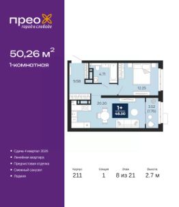 Однокомнатная квартира от застройщика с предчистовой отделкой в ЖК "Прео" на 8 этаже. Общая площадь: 50.26 кв.м., жилая: 12.25 кв.м., площадь просторной кухни-столовой: 20.2 кв.м. Все окна выходят на одну сторону. В квартире одна лоджия, один совмещенный санузел. Высота потолков 2.7 м.