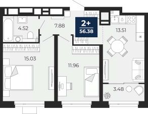 Просторная 2-комн. квартира с предчистовой отделкой в ЖК "Прео" на 14 этаже. Общая площадь: 56.38 кв.м. Высота потолков 2.7 м.
