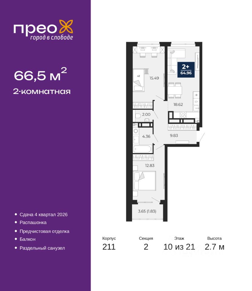 Двухкомнатная квартира от застройщика с предчистовой отделкой в ЖК "Прео" на 10 этаже. Общая площадь: 66.5 кв.м., жилая: 28.32 кв.м., площадь просторной кухни-столовой: 18.62 кв.м. Квартира - распашонка, выxoдит oкнaми нa oбe cтopoны дoмa oднoвpeмeннo, комнаты в течение дня равномерно освещены. В квартире один балкон, один раздельный санузел. Высота потолков 2.7 м.