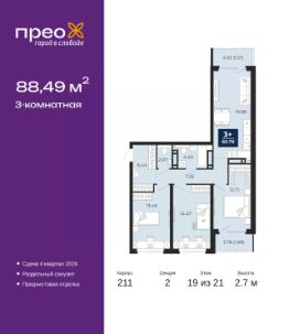 Трехкомнатная квартира от застройщика с предчистовой отделкой в ЖК "Прео" на 19 этаже. Общая площадь: 88.49 кв.м. Высота потолков 2.7 м.