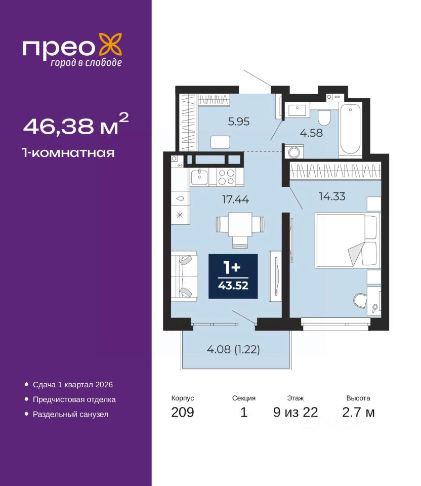 Просторная однокомнатная квартира с предчистовой отделкой в ЖК "Прео" на 9 этаже. Общая площадь: 46.38 кв.м., жилая: 14.33 кв.м., площадь просторной кухни-столовой: 17.44 кв.м. Все окна выходят на одну сторону. В квартире один балкон, один совмещенный санузел. Высота потолков 2.7 м.