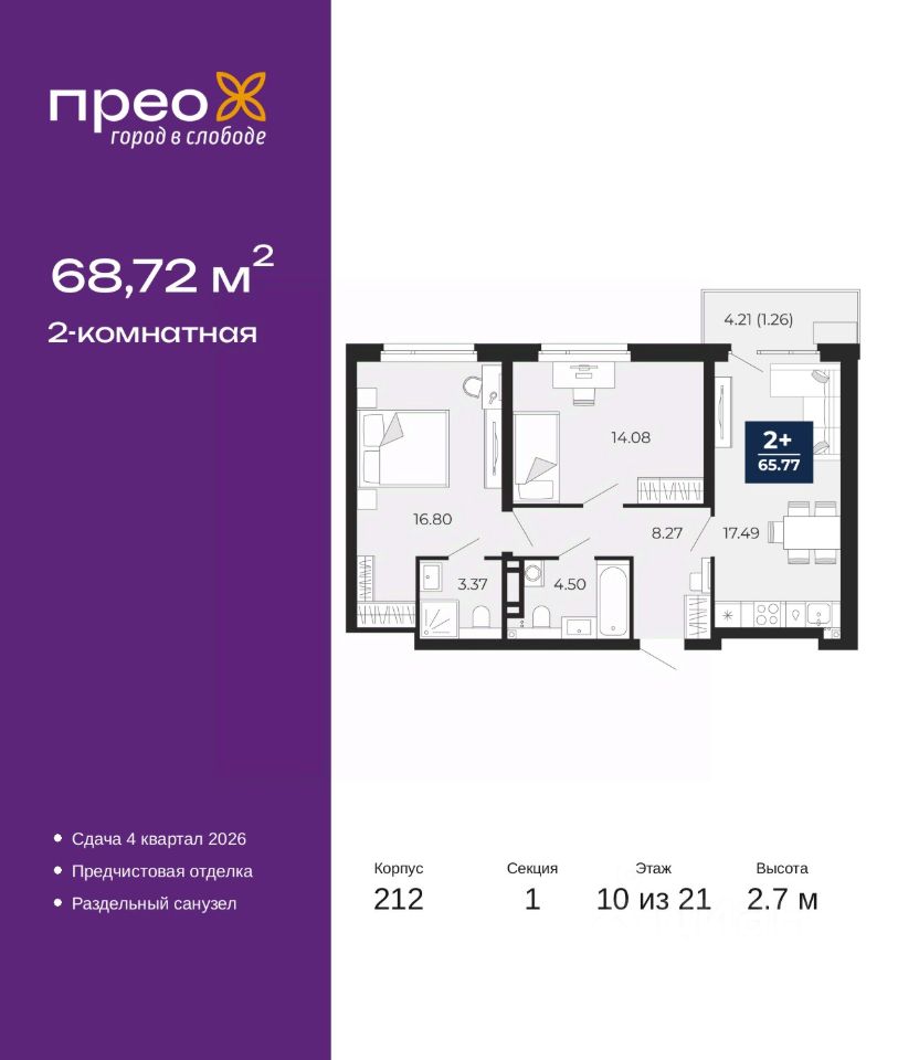 2-комн. квартира с предчистовой отделкой в ЖК "Прео" на 10 этаже. Общая площадь: 68.72 кв.м. Высота потолков 2.7 м.