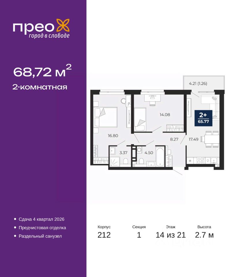 2-комн. квартира от застройщика с предчистовой отделкой в ЖК "Прео" на 14 этаже. Общая площадь: 68.72 кв.м. Высота потолков 2.7 м.