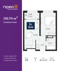 Просторная однокомнатная квартира с предчистовой отделкой в ЖК "Прео" на 18 этаже. Общая площадь: 39.74 кв.м. Высота потолков 2.7 м.