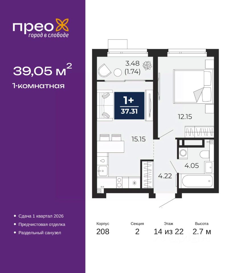 1-комн. квартира с предчистовой отделкой в ЖК "Прео" на 14 этаже. Общая площадь: 39.05 кв.м. Высота потолков 2.7 м.