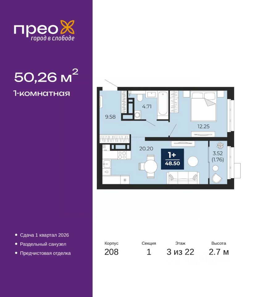 Просторная однокомнатная квартира с предчистовой отделкой в ЖК "Прео" на 3 этаже. Общая площадь: 50.26 кв.м. Высота потолков 2.7 м.