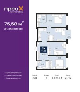 Просторная 3-комн. квартира с предчистовой отделкой в ЖК "Прео" на 14 этаже. Общая площадь: 75.58 кв.м. Высота потолков 2.7 м.