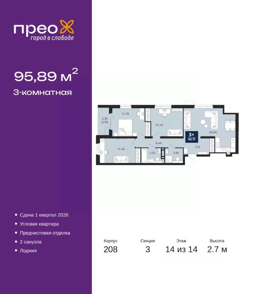 Трехкомнатная квартира с предчистовой отделкой в ЖК "Прео" на 14 этаже. Общая площадь: 95.89 кв.м., жилая: 43.3 кв.м., площадь просторной кухни-столовой: 26.06 кв.м. Квартира угловая, очень светлая, естественная вентиляция при открытии окон. В квартире одна лоджия, два совмещенных санузла. Высота потолков 2.7 м.