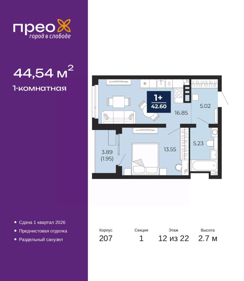 Продается 1-комн. квартира с предчистовой отделкой в ЖК "Прео" на 12 этаже. Общая площадь: 44.54 кв.м., жилая: 13.55 кв.м., площадь просторной кухни-столовой: 16.85 кв.м. Все окна выходят на одну сторону. В квартире одна лоджия, один совмещенный санузел. Высота потолков 2.7 м.