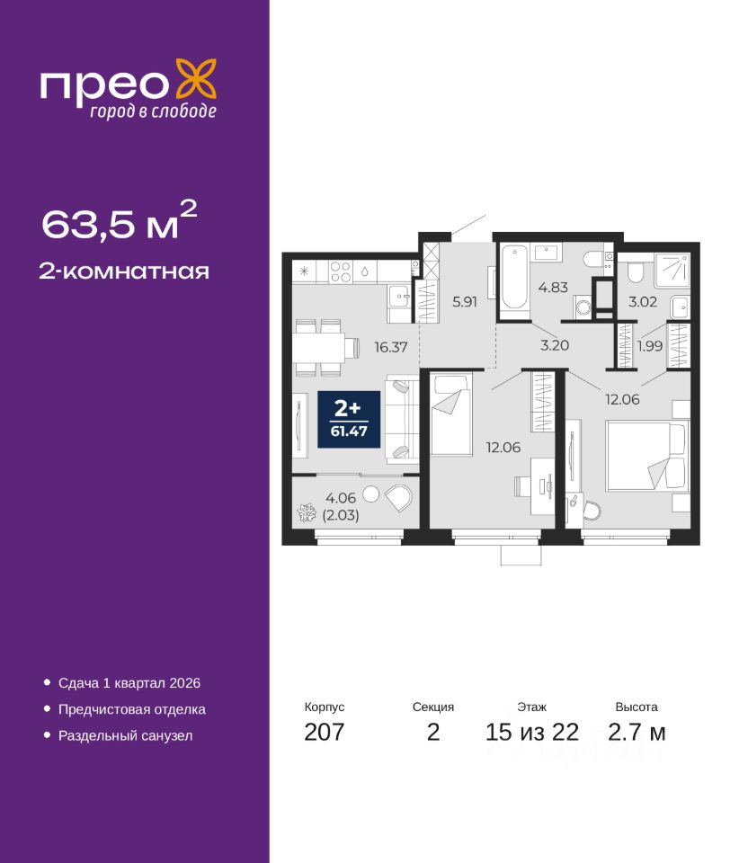 2-комн. квартира от застройщика с предчистовой отделкой в ЖК "Прео" на 15 этаже. Общая площадь: 63.5 кв.м. Высота потолков 2.7 м.