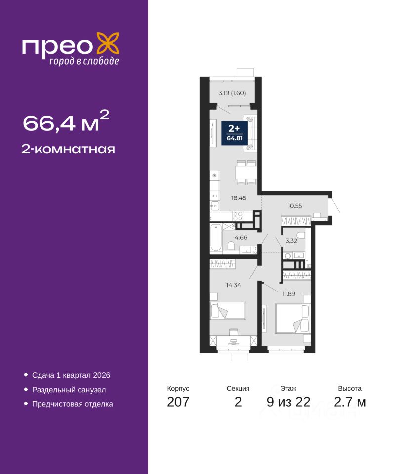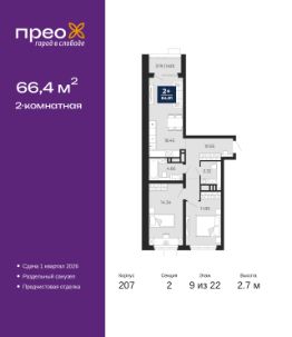 Продается двухкомнатная квартира от застройщика с предчистовой отделкой в ЖК "Прео" на 9 этаже. Общая площадь: 66.4 кв.м. Высота потолков 2.7 м.