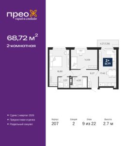 Продается двухкомнатная квартира с предчистовой отделкой в ЖК "Прео" на 9 этаже. Общая площадь: 68.72 кв.м. Высота потолков 2.7 м.