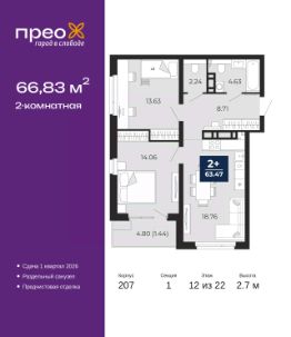2-комн. квартира с предчистовой отделкой в ЖК "Прео" на 12 этаже. Общая площадь: 66.83 кв.м. Высота потолков 2.7 м.