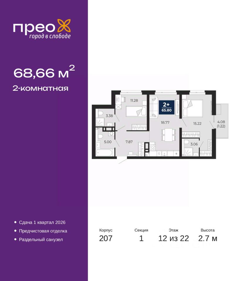 2-комн. квартира от застройщика с предчистовой отделкой в ЖК "Прео" на 12 этаже. Общая площадь: 68.66 кв.м. Высота потолков 2.7 м.