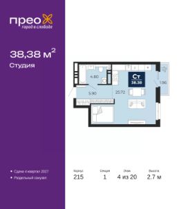1-комн. квартира-студия в ЖК "Прео" на 4 этаже. Общая площадь: 38.38 кв.м. Высота потолков 2.7 м.