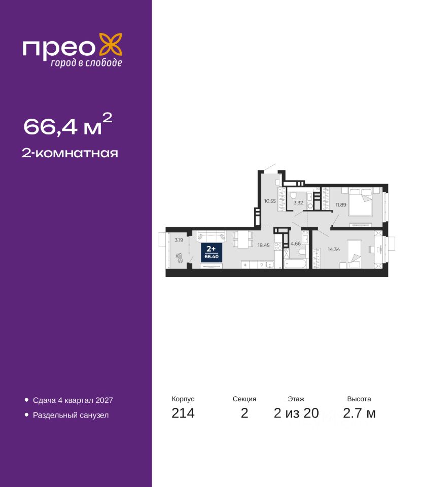 Спешите забронировать, пока действует скидка, предложение ограничено! Стоимость квартиры указана со скидкой, ваша экономия составит 412,000 руб. Информация по телефону, наши менеджеры вам все расскажут. 2-комн. квартира в ЖК "Прео" на 2 этаже. Общая площадь: 66.4 кв.м. Высота потолков 2.7 м. Дом монолитный, двухподъездный, переменной этажности, от 12 до 20 этажей. Квартира находится во 2-й секции высотой 20 этажей в корпусе 214. На этаже 8 квартир. В подъезде 1 пассажирский и 1 грузовой лифт. Окончание строительства - 4 квартал 2027 года. Оформление сделки по договору долевого участия. Преображенский — один из самых привлекательных районов для жизни! Это полностью самостоятельный жилой район с точки зрения инфраструктуры. Преображенский находится между Московским и Червишевским трактами в квартале улиц Закалужская — Вьюжная — Александра Протозанова. Не нужно ждать, когда появится инфраструктура — переезжайте на всё готовое. Вблизи расположены действующие школа и детский сад. В этом году откроется еще один сад, а в следующем году — школа. По соседству с Преображенским запланировано строительство городского парка "Комарово" площадью 38 гектар. За 10 минут можно доехать на автомобиле до крупных ТРЦ: "Лента", "Кристалл", "Леруа Мерлен", "Метро" и "Ашан". С 2018 года в районе открыт Соседский центр — пространство, созданное для формирования добрососедской среды, совместного досуга, общения и реализации соседских инициатив. Здесь проходят встречи соседей, а также сами жители района организовывают мероприятия. Организатором такого события может стать любой желающий. В квартирах выполнена качественная предчистовая отделка. Гладкие стены с финишным выравниванием по маякам. Ровный потолок для установки натяжного потолка. Установлены пятикамерные окна с двойным стеклопакетом (3 стекла). Дизайнерские холлы с видеонаблюдением, безбарьерным и прозрачным входом всегда светло и спокойно. На первом этаже есть просторные колясочные, где все жители могут оставлять свои коляски и велосипеды. В Преображенском есть всё, что нужно для активного отдыха и занятий спортом. Мы сделали большое футбольное поле с безопасным покрытием. Также установили хоккейный корт, который оборудован по всем необходимым стандартам. Во дворах можно делать упражнения на специальных площадках с турниками. Весь район мы обустроили велодорожками, которые связаны в единый маршрут. У нас есть сухие фонтаны, бьющие из земли, деревья, веревки, сетки, скалодром, газон, песок и резинка — осталось просто дать своему ребенку право на свободную игру. По-настоящему хорошие дворы — это те, которые дети предпочитают соцсетям и телевизору. Аккредитация в банках: ОАО "Альфа-Банк", ПАО "Газпромбанк", ПАО Банк "ВТБ", ПАО "Банк Уралсиб", "Сбербанк России" и других. #2mDfES
