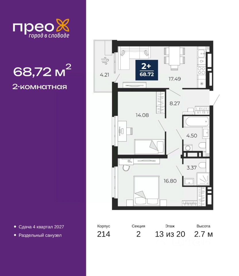 2-комн. квартира в ЖК "Прео" на 13 этаже. Общая площадь: 68.72 кв.м. Высота потолков 2.7 м.