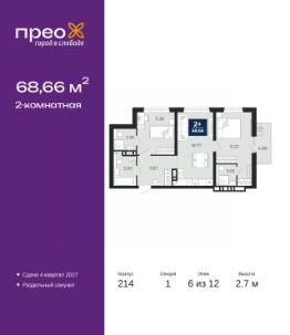 Просторная двухкомнатная квартира в ЖК "Прео" на 6 этаже. Общая площадь: 68.66 кв.м. Высота потолков 2.7 м.