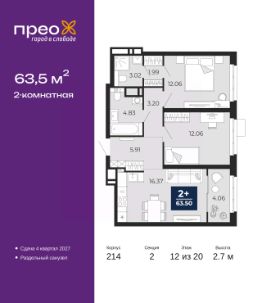 Торопитесь забронировать, пока действует скидка, период акции ограничен! Стоимость квартиры указана со скидкой, ваша экономия составит 448,500 руб. По всем вопросам звоните в офис продаж, наши менеджеры вам все расскажут. Продается 2-комн. квартира в ЖК "Прео" на 12 этаже. Общая площадь: 63.5 кв.м. Высота потолков 2.7 м. Дом монолитный, двухподъездный, переменной этажности, от 12 до 20 этажей. Квартира находится во 2-й секции высотой 20 этажей в корпусе 214. На этаже 8 квартир. В подъезде 1 пассажирский и 1 грузовой лифт. Окончание строительства - 4 квартал 2027 года. Оформление сделки по договору долевого участия. Преображенский — один из самых привлекательных районов для жизни! Это полностью самостоятельный жилой район с точки зрения инфраструктуры. Преображенский находится между Московским и Червишевским трактами в квартале улиц Закалужская — Вьюжная — Александра Протозанова. Не нужно ждать, когда появится инфраструктура — переезжайте на всё готовое. Вблизи расположены действующие школа и детский сад. В этом году откроется еще один сад, а в следующем году — школа. По соседству с Преображенским запланировано строительство городского парка "Комарово" площадью 38 гектар. За 10 минут можно доехать на автомобиле до крупных ТРЦ: "Лента", "Кристалл", "Леруа Мерлен", "Метро" и "Ашан". С 2018 года в районе открыт Соседский центр — пространство, созданное для формирования добрососедской среды, совместного досуга, общения и реализации соседских инициатив. Здесь проходят встречи соседей, а также сами жители района организовывают мероприятия. Организатором такого события может стать любой желающий. В квартирах выполнена качественная предчистовая отделка. Гладкие стены с финишным выравниванием по маякам. Ровный потолок для установки натяжного потолка. Установлены пятикамерные окна с двойным стеклопакетом (3 стекла). Дизайнерские холлы с видеонаблюдением, безбарьерным и прозрачным входом всегда светло и спокойно. На первом этаже есть просторные колясочные, где все жители могут оставлять свои коляски и велосипеды. В Преображенском есть всё, что нужно для активного отдыха и занятий спортом. Мы сделали большое футбольное поле с безопасным покрытием. Также установили хоккейный корт, который оборудован по всем необходимым стандартам. Во дворах можно делать упражнения на специальных площадках с турниками. Весь район мы обустроили велодорожками, которые связаны в единый маршрут. У нас есть сухие фонтаны, бьющие из земли, деревья, веревки, сетки, скалодром, газон, песок и резинка — осталось просто дать своему ребенку право на свободную игру. По-настоящему хорошие дворы — это те, которые дети предпочитают соцсетям и телевизору. Аккредитация в банках: ПАО "Банк Уралсиб", ПАО "Газпромбанк", "Сбербанк России", ПАО Банк "ВТБ", ОАО "Альфа-Банк" и других. #26Eodo