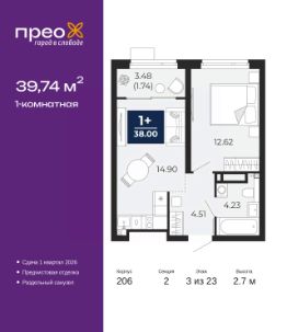 Однокомнатная квартира от застройщика с предчистовой отделкой в ЖК "Прео" на 3 этаже. Общая площадь: 39.74 кв.м. Высота потолков 2.7 м.