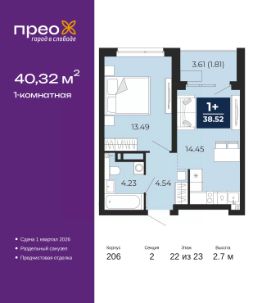 Однокомнатная квартира от застройщика с предчистовой отделкой в ЖК "Прео" на 22 этаже. Общая площадь: 40.32 кв.м., жилая: 13.49 кв.м., площадь просторной кухни-столовой: 14.45 кв.м. Все окна выходят на одну сторону. В квартире одна лоджия, один совмещенный санузел. Высота потолков 2.7 м.